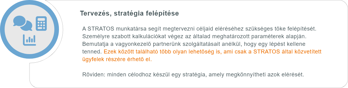 A STRATOS munkatársa segít megtervezni céljaid eléréséhez szükséges tőke felépítését. Személyre szabott kalkulációkat végez az általad meghatározott paraméterek alapján. Bemutatja a vagyonkezelő partnerünk szolgáltatásait anélkül, hogy egy lépést kellene tenned. Ezek között található több olyan lehetőség is, ami csak a STRATOS által közvetített ügyfelek részére érhető el.