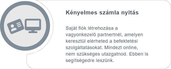Saját fiók létrehozása a vagyonkezelő partnertnél, amelyen keresztül elérheted a befektetési szolgáltatásokat. Mindezt online, nem szükséges utazgatnod. Ebben is segítségedre leszünk.